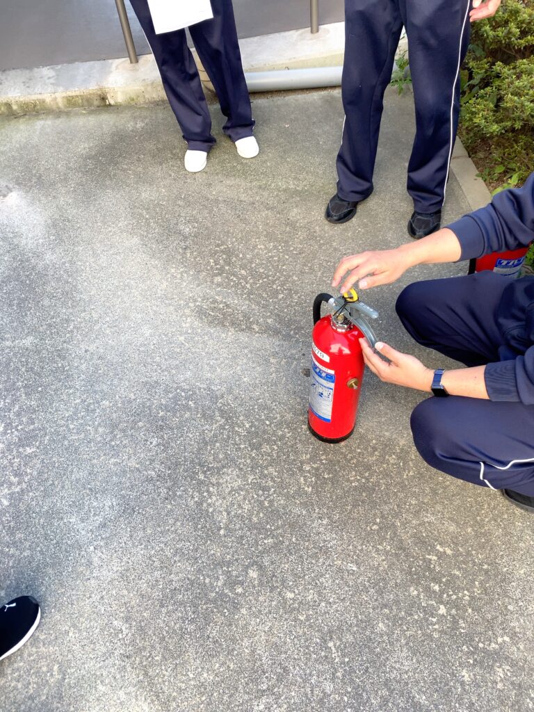 消防署からお借りした消火器(中身は水です)を使って、参加者全員が実際に使用、体験しました。