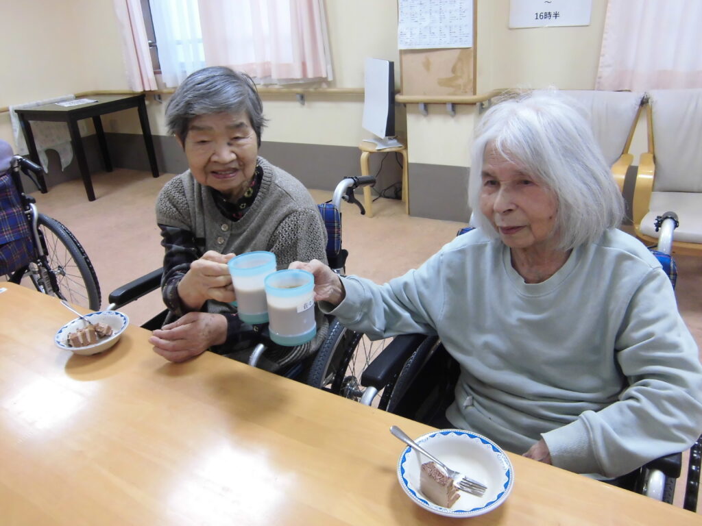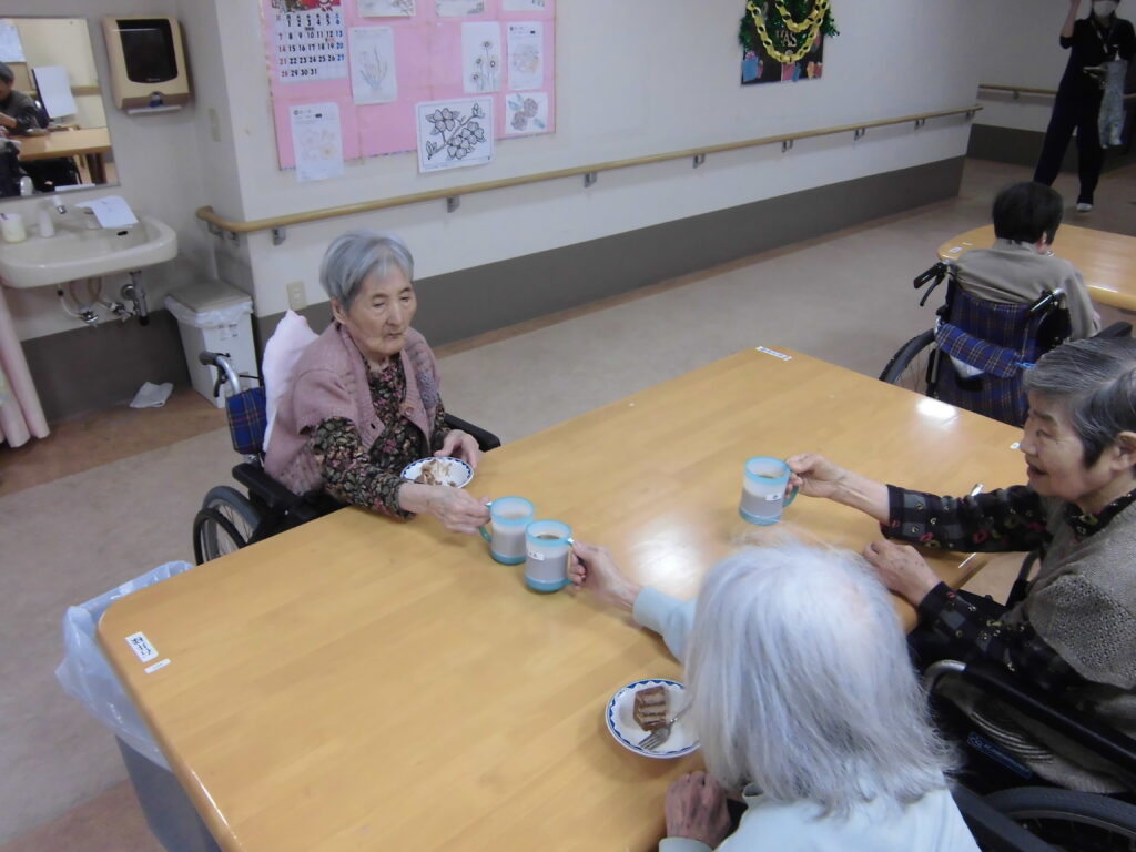 乾杯はコーヒーでされる入居者様も♬ゆっくり談笑されながらケーキをご堪能されました!