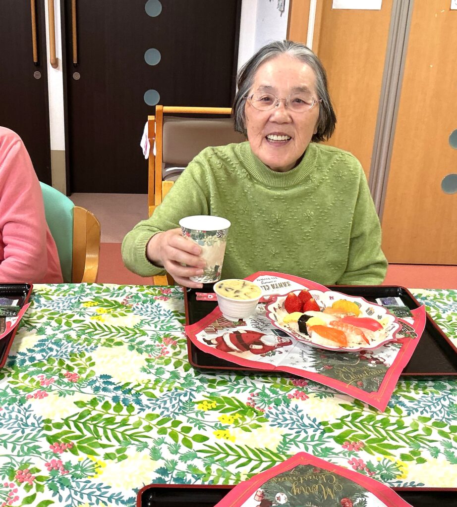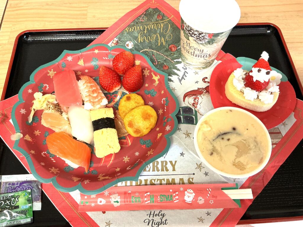 お寿司とサンタの可愛いデザート。「美味しい!」と笑顔で召し上がっておられました。