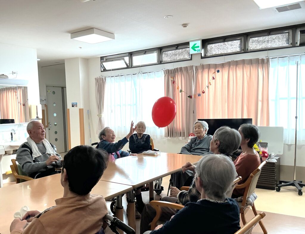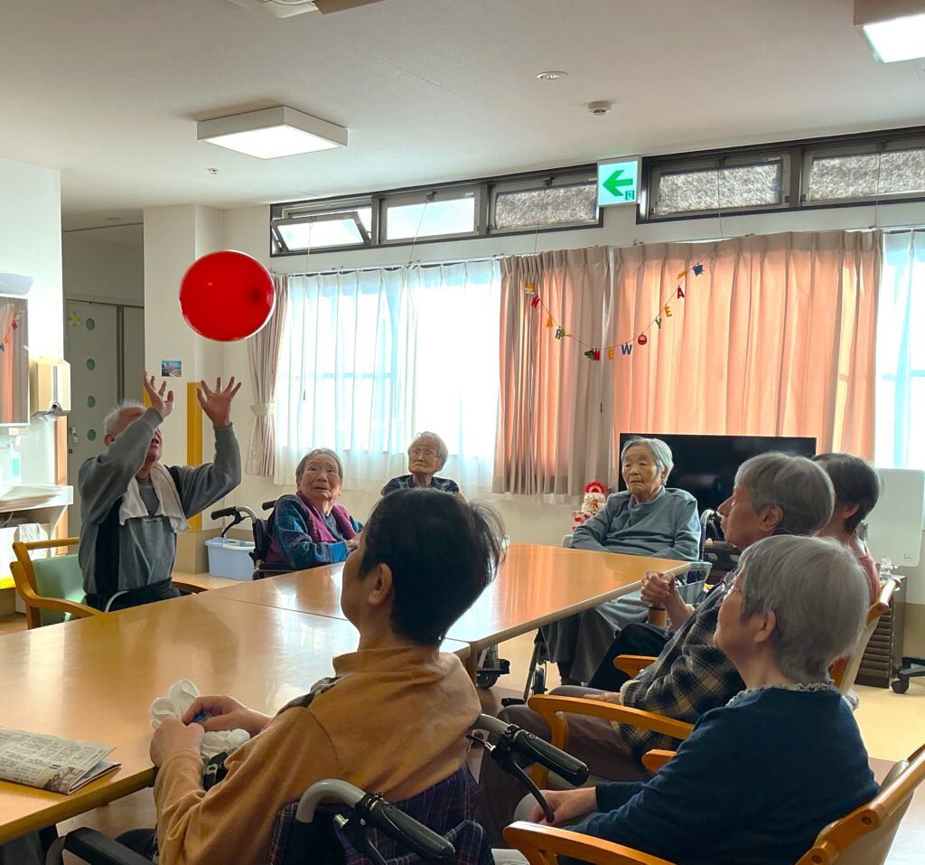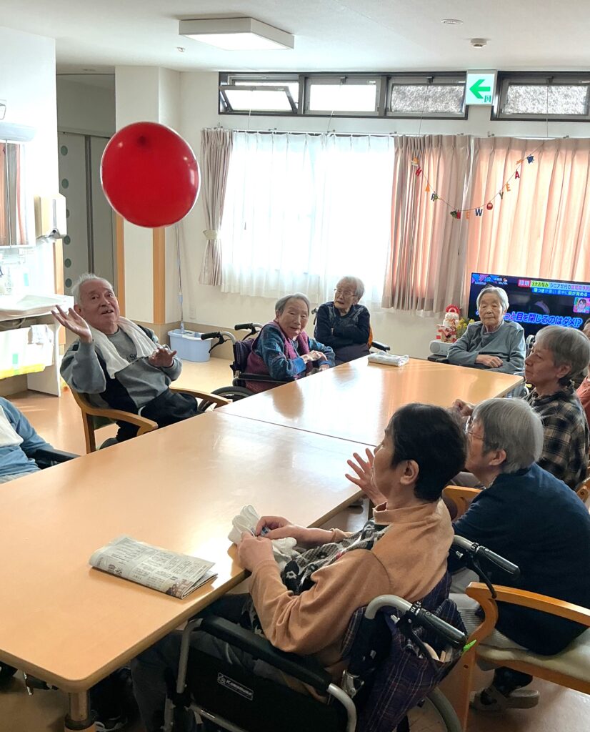 先日、グループホーム2階フロアで風船バレーが行われていて、